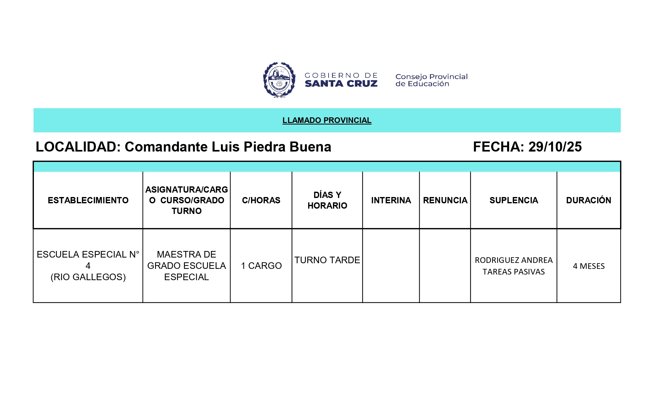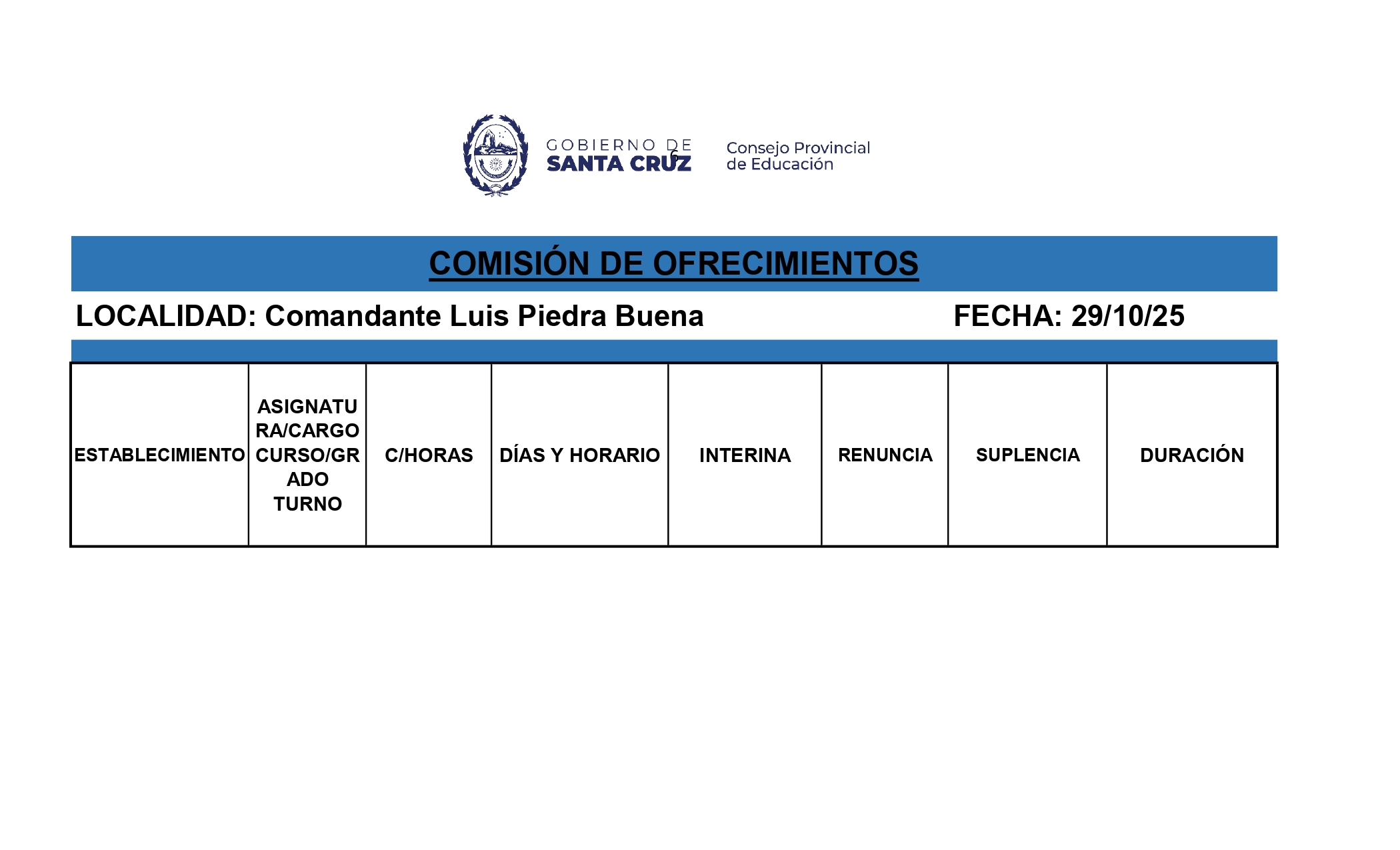 29/10/2025 | El Consejo Provincial de Educación, a través de las Comisiones de Ofrecimientos, informa que se encuentran disponibles los listados para acceder a los cargos y horas cátedra en establecimientos de diferentes localidades. Los mismos se realizarán de manera presencial.