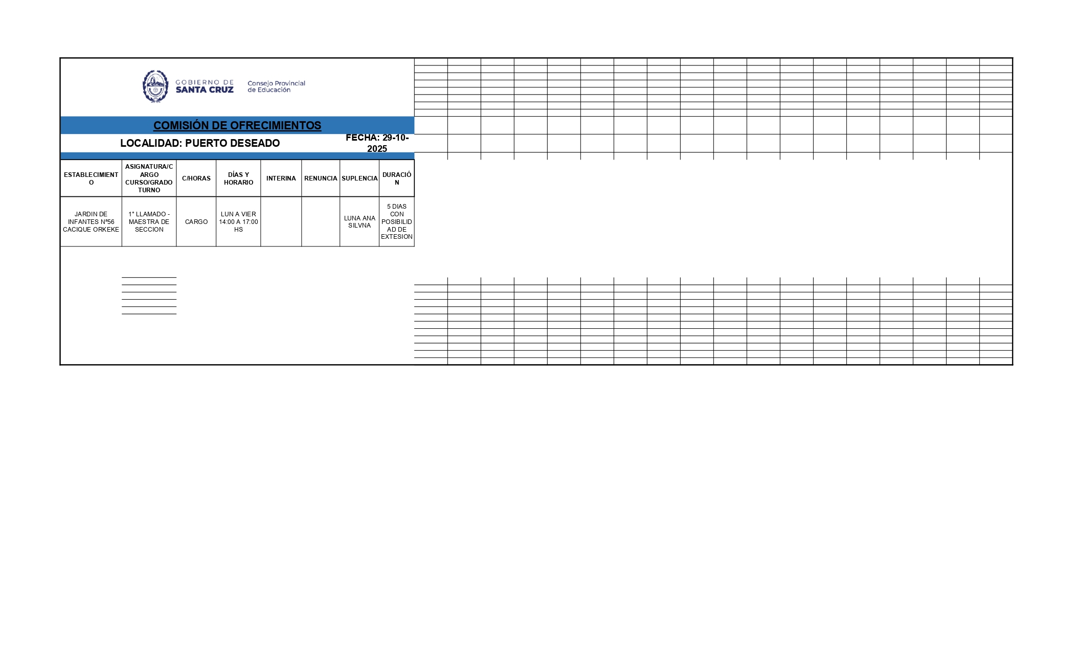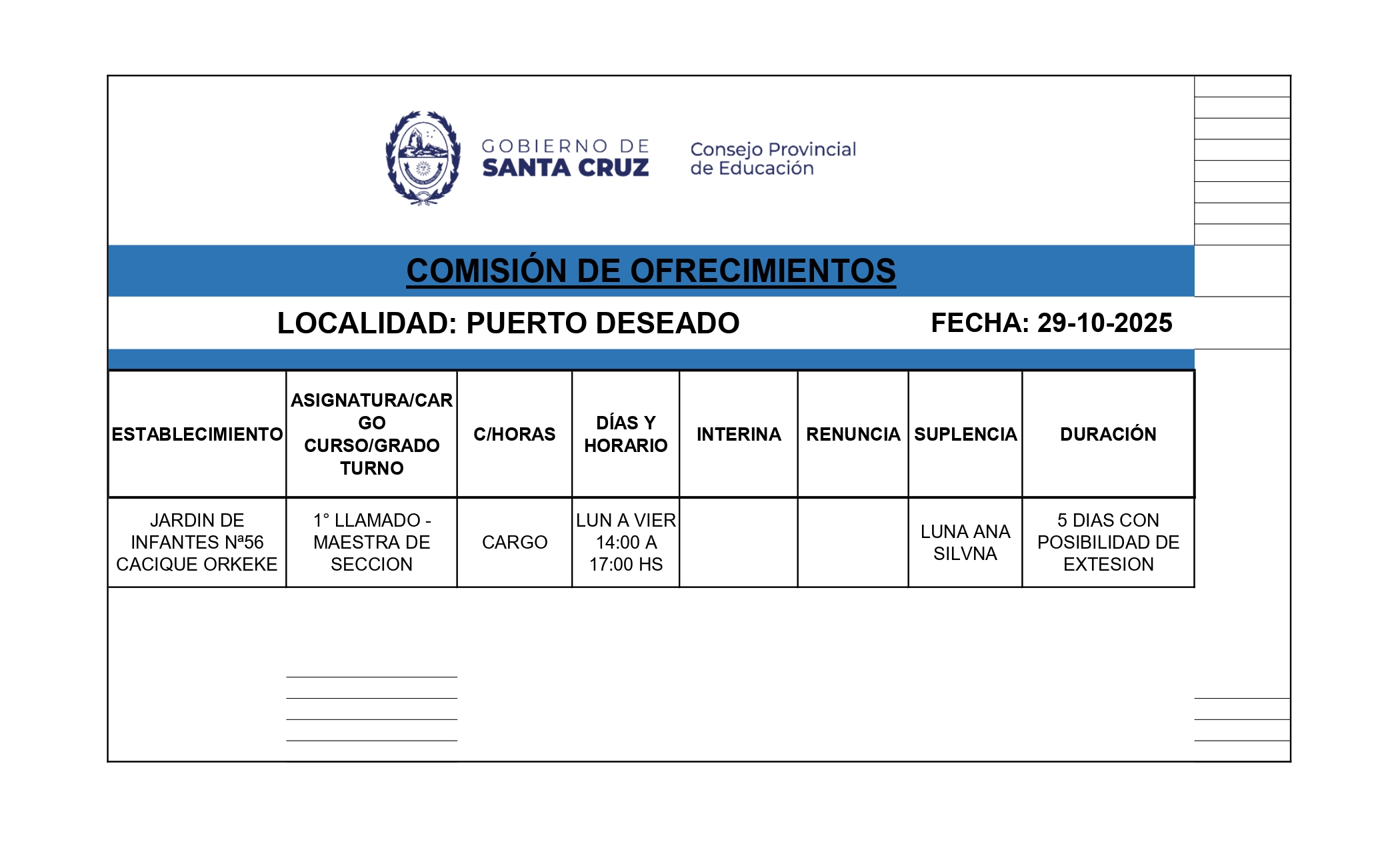 29/10/2025 | El Consejo Provincial de Educación, a través de las Comisiones de Ofrecimientos, informa que se encuentran disponibles los listados para acceder a los cargos y horas cátedra en establecimientos de diferentes localidades. Los mismos se realizarán de manera presencial.