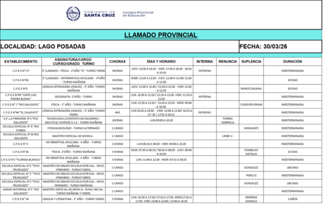 30/03/2026 | El Consejo Provincial de Educación, a través de las Comisiones de Ofrecimientos, informa que se encuentran disponibles los listados para acceder a los cargos y horas cátedra en establecimientos de diferentes localidades. Los mismos se realizarán de manera presencial.
