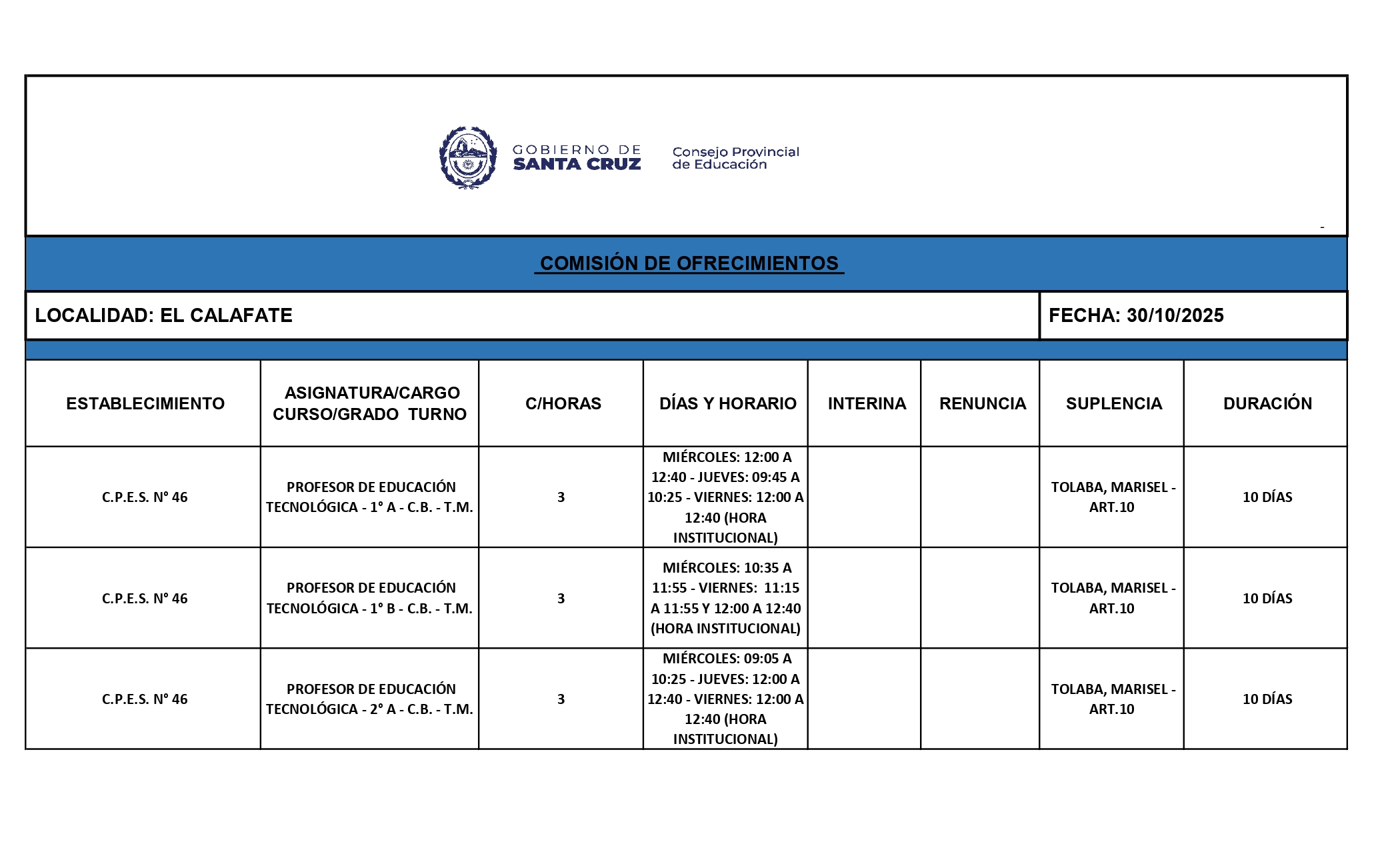 30/10/2025 | El Consejo Provincial de Educación, a través de las Comisiones de Ofrecimientos, informa que se encuentran disponibles los listados para acceder a los cargos y horas cátedra en establecimientos de diferentes localidades. Los mismos se realizarán de manera presencial.