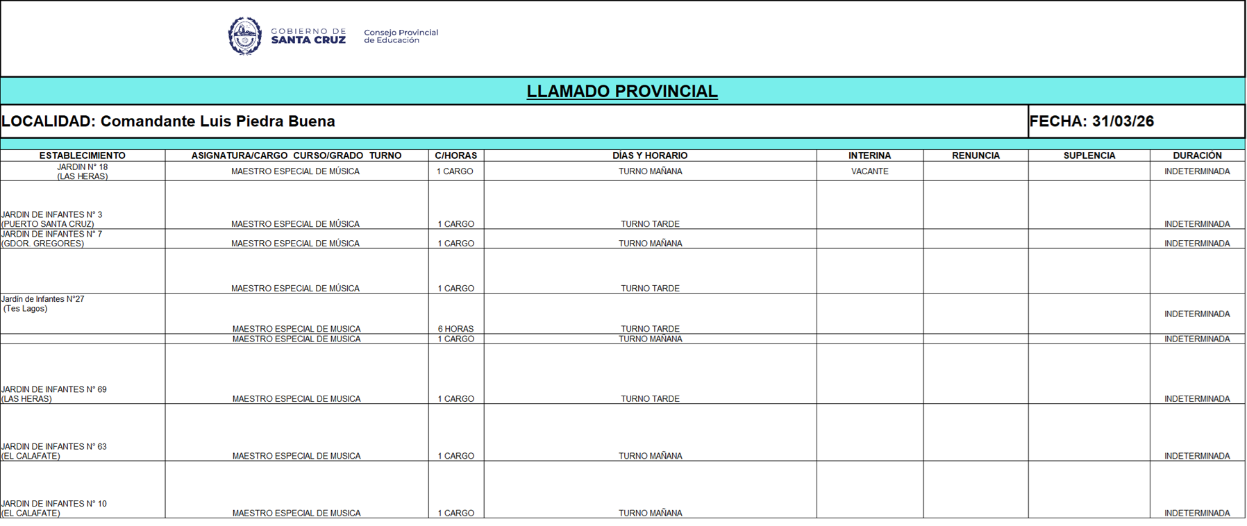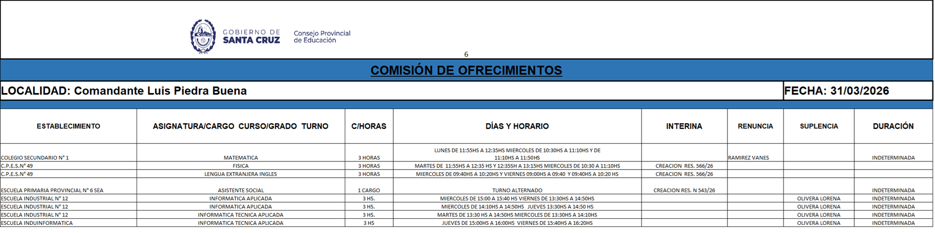 31/03/2026 | El Consejo Provincial de Educación, a través de las Comisiones de Ofrecimientos, informa que se encuentran disponibles los listados para acceder a los cargos y horas cátedra en establecimientos de diferentes localidades. Los mismos se realizarán de manera presencial.