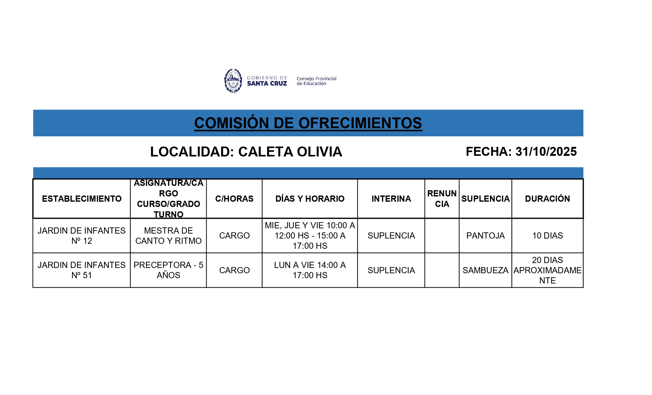 31/10/2025 | El Consejo Provincial de Educación, a través de las Comisiones de Ofrecimientos, informa que se encuentran disponibles los listados para acceder a los cargos y horas cátedra en establecimientos de diferentes localidades. Los mismos se realizarán de manera presencial.