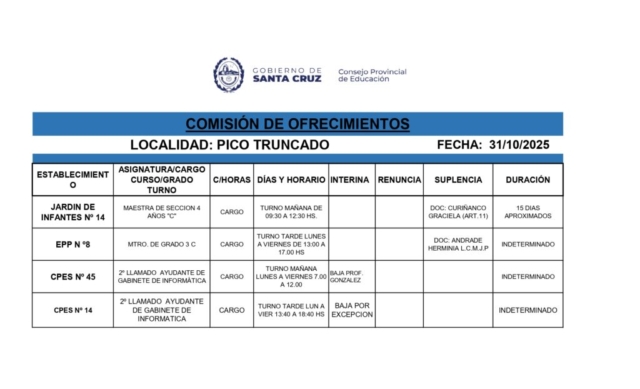 30/10/2025 | El Consejo Provincial de Educación, a través de las Comisiones de Ofrecimientos, informa que se encuentran disponibles los listados para acceder a los cargos y horas cátedra en establecimientos de diferentes localidades. Los mismos se realizarán de manera presencial.