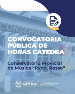 El Consejo Provincial de Educación, a través de la Dirección General de Educación Artística, informa que abre convocatoria pública para la cobertura de Horas Cátedra docente pertenecientes al PLAN NIÑOS del Conservatorio Provincial de Música “Rvdo. Eugenio Rosso”, de Río Gallegos.