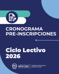 El Gobierno de la Provincia de Santa Cruz, a través del Consejo Provincial de Educación, informa a la comunidad educativa el cronograma de fechas, horarios y modalidades correspondientes a la instancia de Preinscripciones para el Ingreso a los distintos niveles y modalidades del Sistema Educativo Provincial para el Ciclo Lectivo 2026. Asimismo, se comunica que el link de inscripción para las modalidades virtuales será publicado el mismo día habilitado para cada localidad, a través de los canales oficiales del Consejo Provincial de Educación.