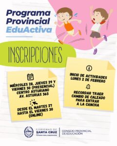 El Consejo Provincial de Educación informa que se encuentran abiertas las inscripciones para las actividades gratuitas del Programa Provincial EduActiva, que se desarrollarán en el Centro Asturiano, en la ciudad de Río Gallegos.