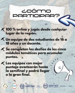 Finalmente, la Prof. Paulina Salemi detalló que podrán participar estudiantes de Nivel Secundario conformando equipos junto a un docente, representando a sus instituciones educativas, y que la propuesta es 100% online y gratuita.