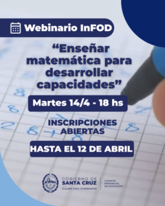 En esta oportunidad, se desarrollará el webinario “Enseñar matemática para desarrollar capacidades”, que tendrá lugar el martes 14 de abril a las 18:00, con la disertación del especialista Lic. Rodrigo Díaz.