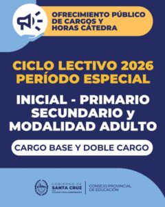 El Consejo Provincial de Educación informa el Ofrecimiento Público de Cargos y Horas Cátedra, correspondiente al Ciclo Lectivo 2026 - Período Especial, destinado a los niveles Inicial, Primario y Secundario y sus modalidades.